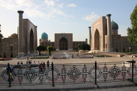 Genauso, wie er seine Feinde unterjochte, verfuhr Timur auch mit den Bewohnern seiner ach so geliebten Stadt. Er enteignete ohne Vorwarnung um mitten in der Stadt ein Handels- und Handwerkszentrum zu errichten. So entstand dieser Platz mit der Medrese Ulughbek, links, der Medrese Schirm-dar, rechts, und der Medrese Tella-Kari.